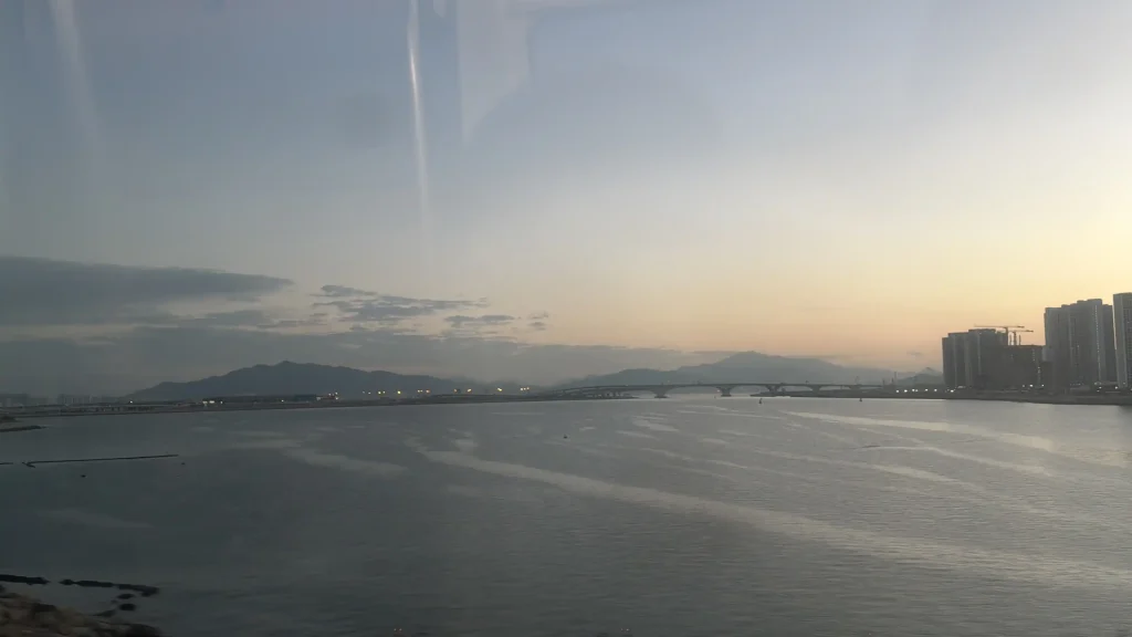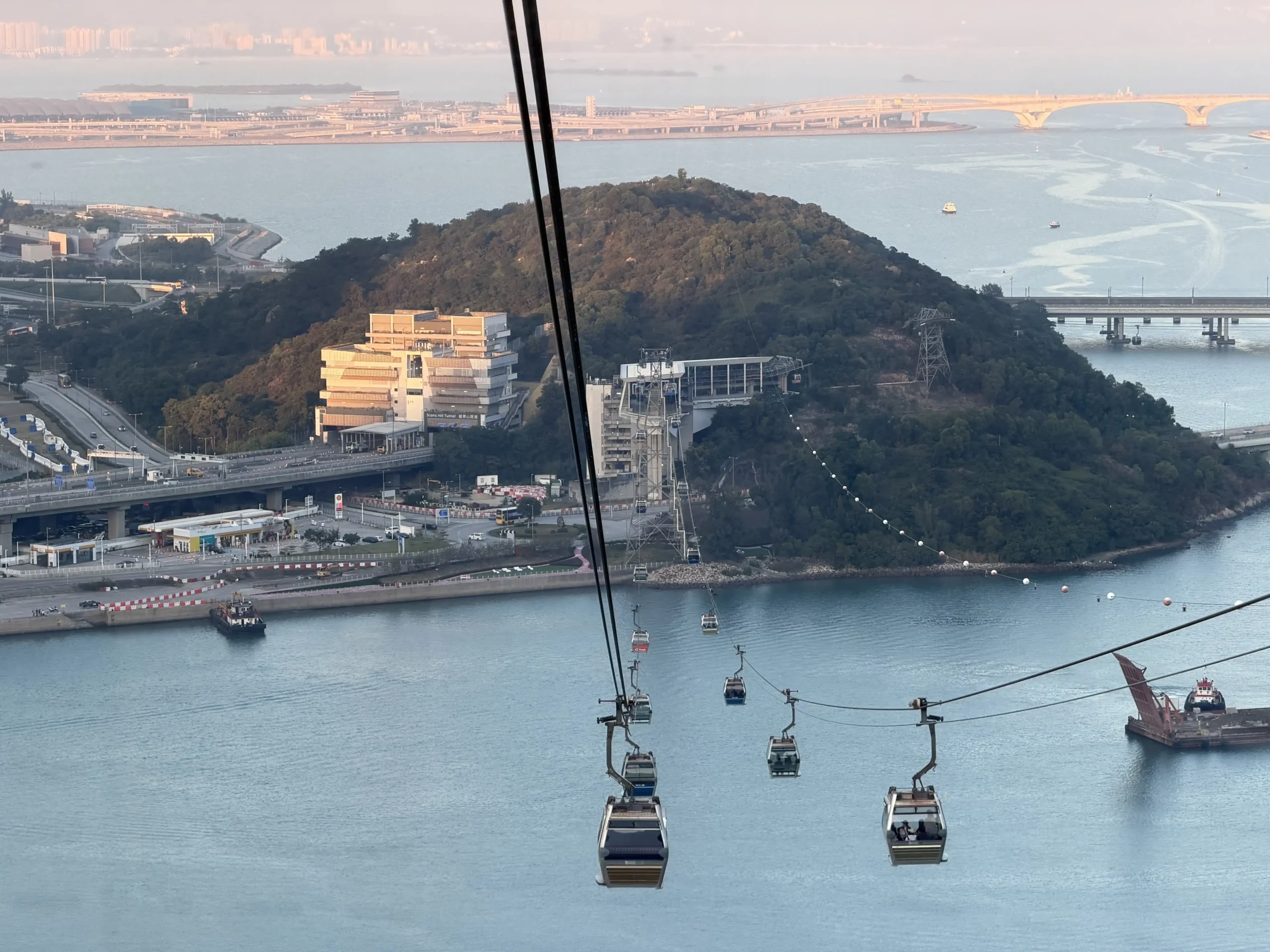 从中午十二点入园到下午五点离开,玩到了大部分的项目,而且明日世界的项目都玩了两遍。由于我已力竭,不想再排队了(也没有预算再买优速通了),所以提议去坐昂坪360缆车,据说可以看到港珠澳大桥。
