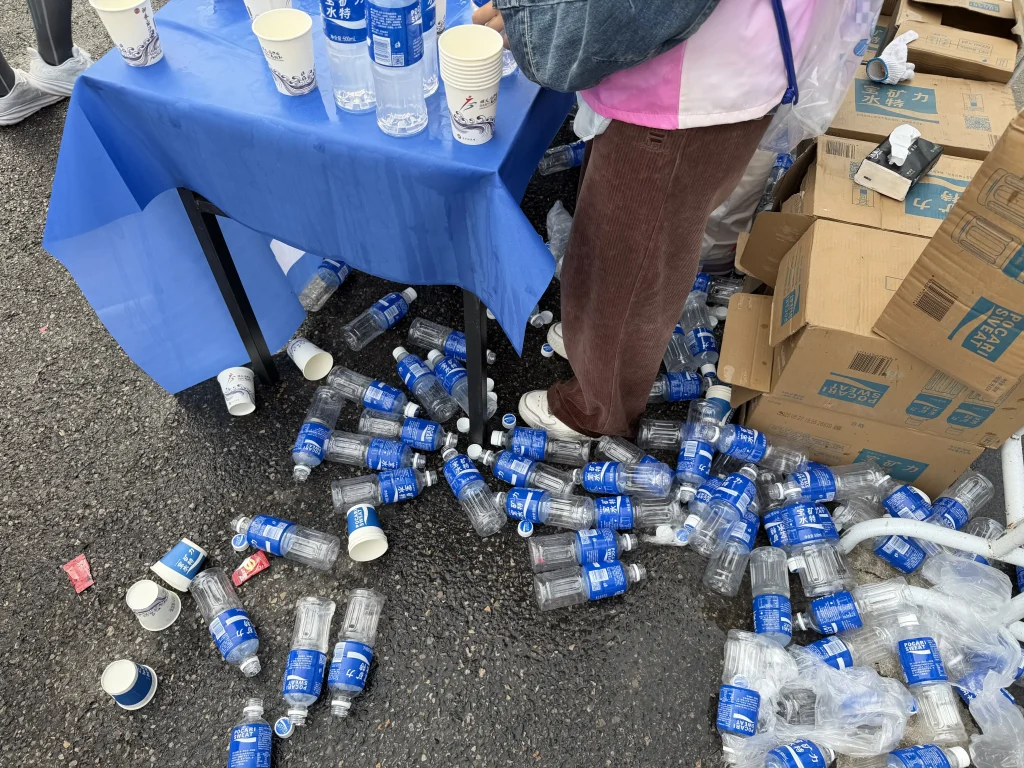 差不多一个小时的时间里,六千名选手从我们的小桌子前经过。仅我们这张桌子就起码消耗了数百个纸杯和六七箱 24 瓶装的宝矿力。