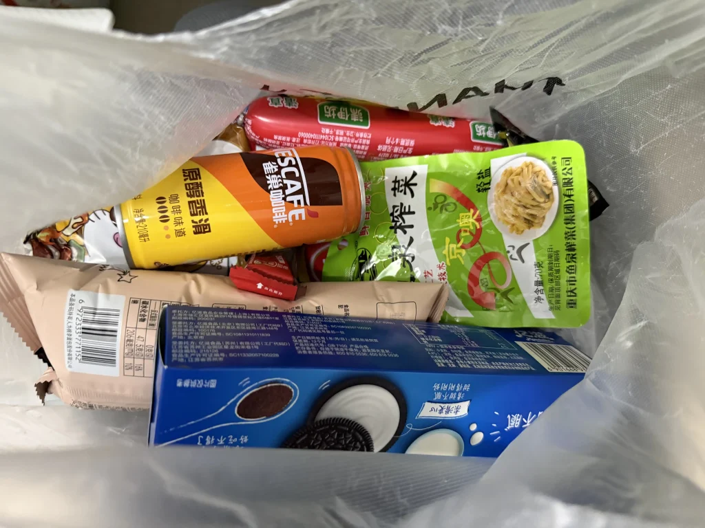 不过最后我收获了一箱免费的 24 瓶宝矿力。除此之外还有两袋免费的神秘食物组合,分别被称为早餐和午餐,实际上是完全一样的两袋。里面包括但不限于奥利奥、火腿肠、八宝粥、巧克力面包、卤蛋、雀巢咖啡、涪陵榨菜和小浣熊干脆面🤔。